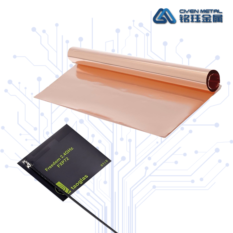 天線電路板就是將接受或發送無線信號的天線通過覆銅板(或柔性覆銅板)蝕刻工藝制作在線路板上的天線,這種天線都是與相關電子原件集成到一起的,并且以模塊的形式使用,其優點是集成度高,可以壓縮體積減少成本,在短距離遙控及通信等方面有著廣泛的應用。銘玨金屬生產的天線電路板專用銅箔具有純度高、抗拉性強、可覆合性好、易蝕刻等優點,是天線電路板必備的基礎材料。